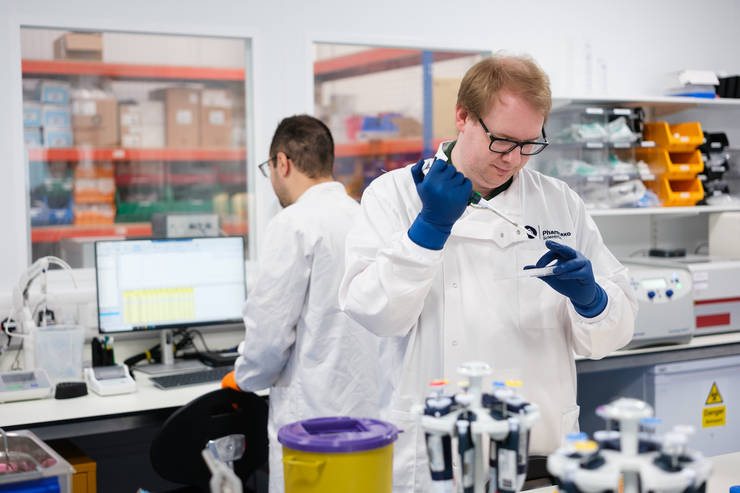 A laboratory worker at Pharmaxo Scientific prepares a pharmaceutical product